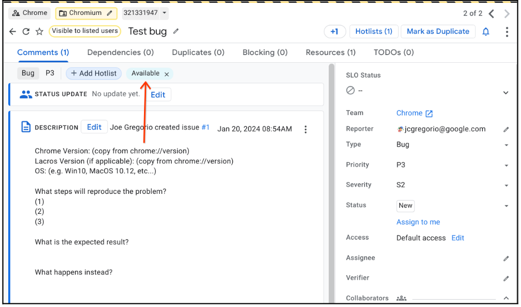 Component. Additional components have been added to theComponent Tagscustom field. - Only hotlists that are owned by a @google.com account or a @chromium.org account and have at least one issue were migrated